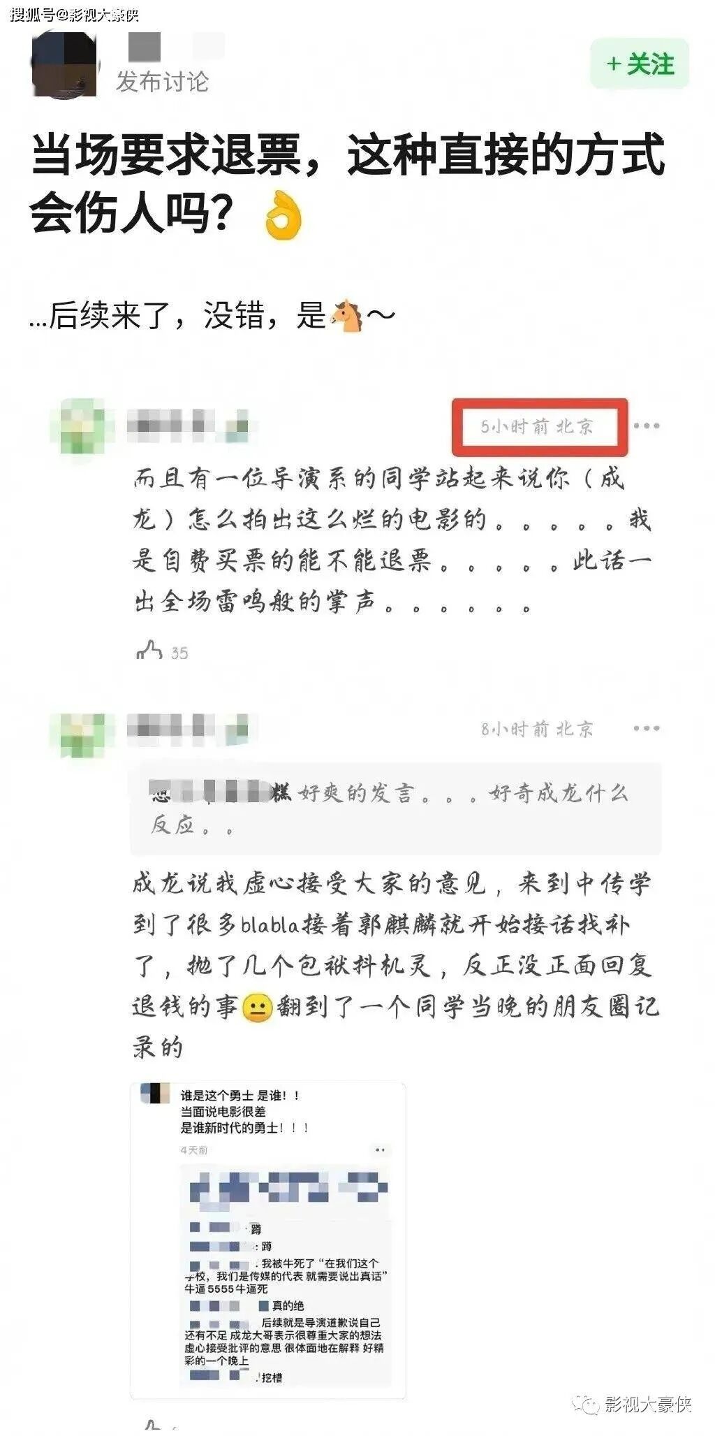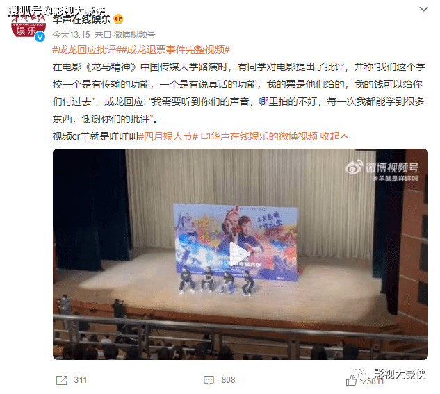 网传消息称,由成龙、刘浩存主演的电影《龙马精神》在中国传媒大学路演时,有观众当场问成龙怎么拍出这么烂的电影,并要求退票,此话一出全场响起雷鸣般的掌声。