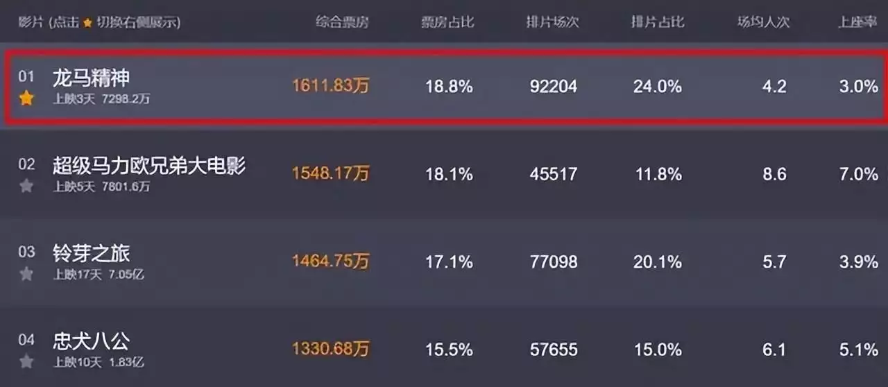 然后看电影院的预售票和排片率对照,必须没错,电影院对甄子丹的影片还是很给“面子”的。一开始预售票都在25%左右,可排片率却相当不平庸,正常只能在3%高踞。这断定观众们对《龙马精神》整部影片热忱并不高。