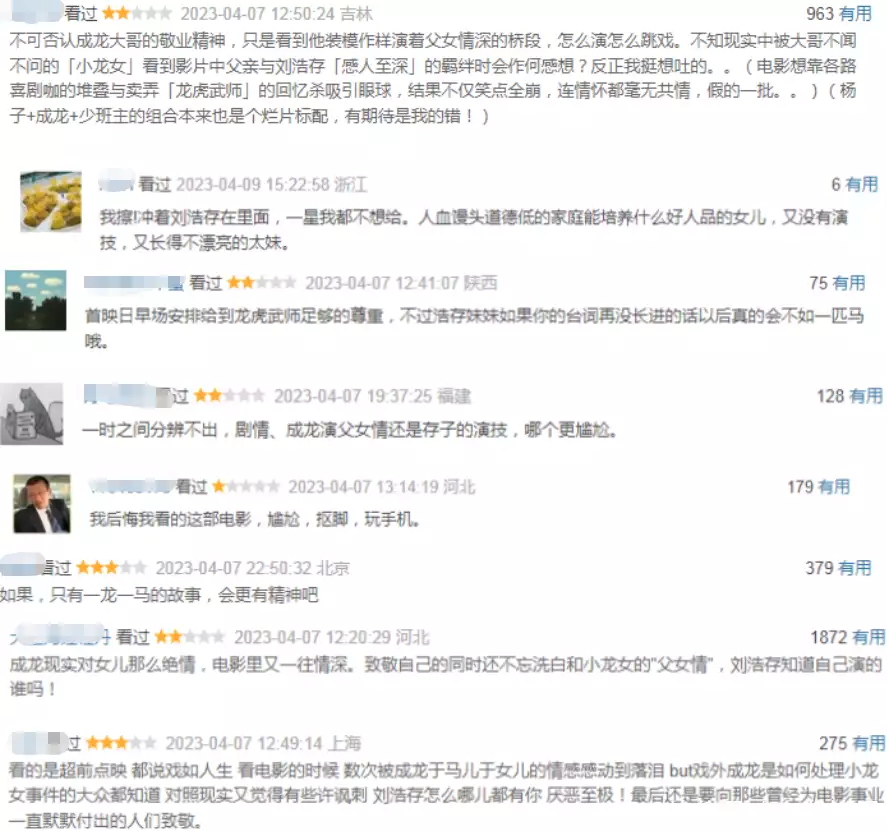 观众们的差评理由,也几乎都相同,首先是刘浩存和甄子丹的父女情深,不仅跳戏还很假,甄子丹的亲生女儿吴卓林他不闻不问,从出生起就被甄子丹抛弃不认可,和刘浩存没有任何亲情关系,却有着大篇幅的亲情戏,给人感觉太假。