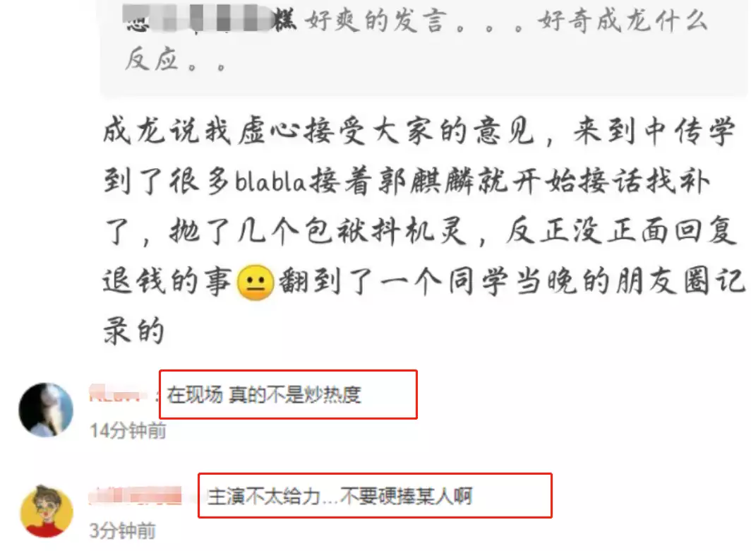 也有许多人确认,自己在现场,确实有那么一回事,当事人很有勇气,但不太礼貌。甄子丹回应我虚心接受大家意见,来到中传学到了很多,随后,郭麒麟转移话题,也没回应退钱的事。