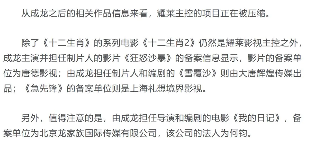 说到甄子丹,还有一个不得不提的话题就是綦建虹与他的耀莱影视 凭借与甄子丹的私交,耀莱影视成为甄子丹品牌在内地的独家拥有者,主控或参与了《十二生肖》《天将雄师》《绝地逃亡》《铁道飞虎》《功夫瑜伽》等电影,线下影城生意也迅速扩张。